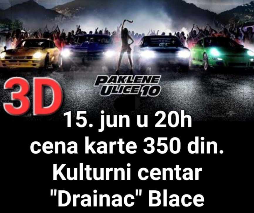 U bioskopu Kulturnog centra Drainac u Blacu u četvrtak, 15.juna biće prikazan 3D film – Paklene ulice 10.Projekcija filma je od 20 časova a cena karte 350 dinara.