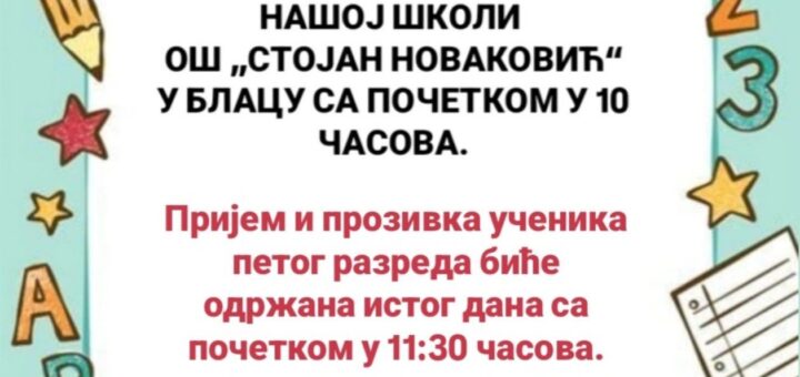 U Osnovnoj školi Stojan Novaković u Blacu u petak, 29.avgusta biće održana priredba, prozivka i svečani prijem prvaka, sa početkom...