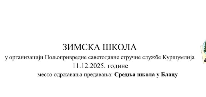 Poljoprivredna savetodavna i stručna služba Kuršumlija, u saradnji sa Srednjom školom Blace, organizuje Zimsku školu za poljoprivrednike koja će biti...