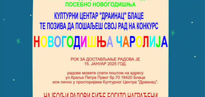 Kulturni centar Drainac Blace te poziva na – NAGRADNI LIKOVNI KONKURS TEMA RADA „ NOVOGODIŠNjA ČAROLIJA“. Propozicije Konkursa: -pravo učešća...