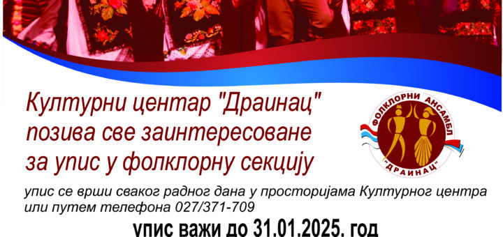 Kulturni centar Drainac Blace poziva sve zainteresovane na upis na folklornu sekciju. Upis se vrši svakog radnog dana u prostorijama...