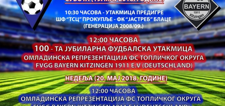 Omladinska reprezentacija Fudbalskog saveza Topličkog okruga sa ekipom FVGG Bayern Kitzingen 1911 E.V , u subotu 19.maja na gradskom stadionu...