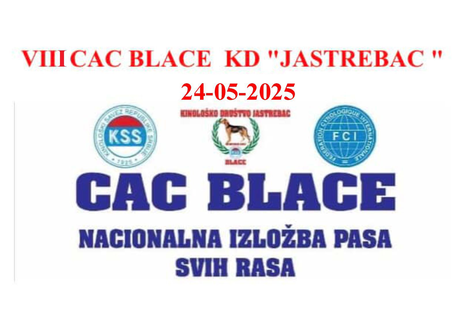 KD Jastrebac Blace u subotu, 24.maja organizuje izložbu pasa VIII CAC Blace.Prijave traju do petka, 23.maja do 13 časova