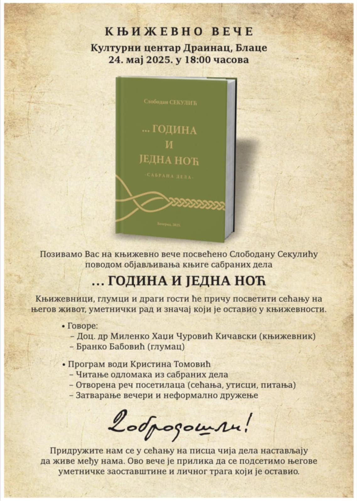 U Kulturnom centru Drainac u Blacu, 24.maja od 18 časova biće održano književno veče u znak sećanja na Slobodana Sekulića, književnika iz Blaca.