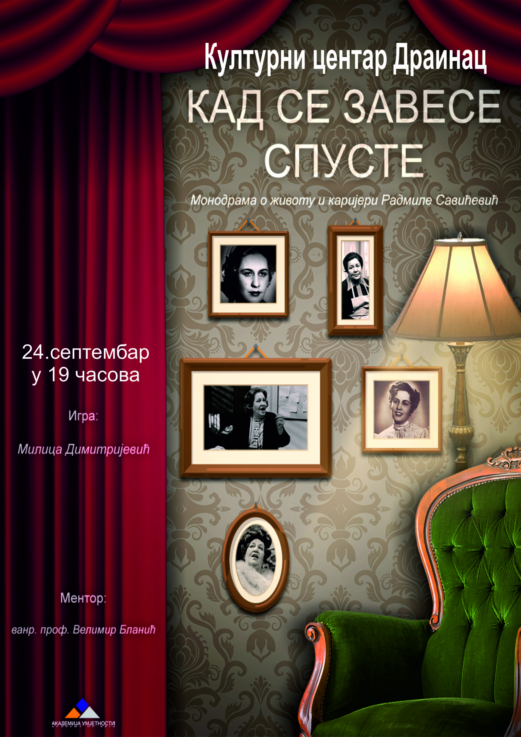 Kulturni centar „Drainac“ organizuje monodramu pod nazivom „Kad se zavese spuste“, posvećenu životu i karijeri glumice Radmile Savićević. Predstava će biti izvedena u utorak, 24. septembra, sa početkom u 19 časova.