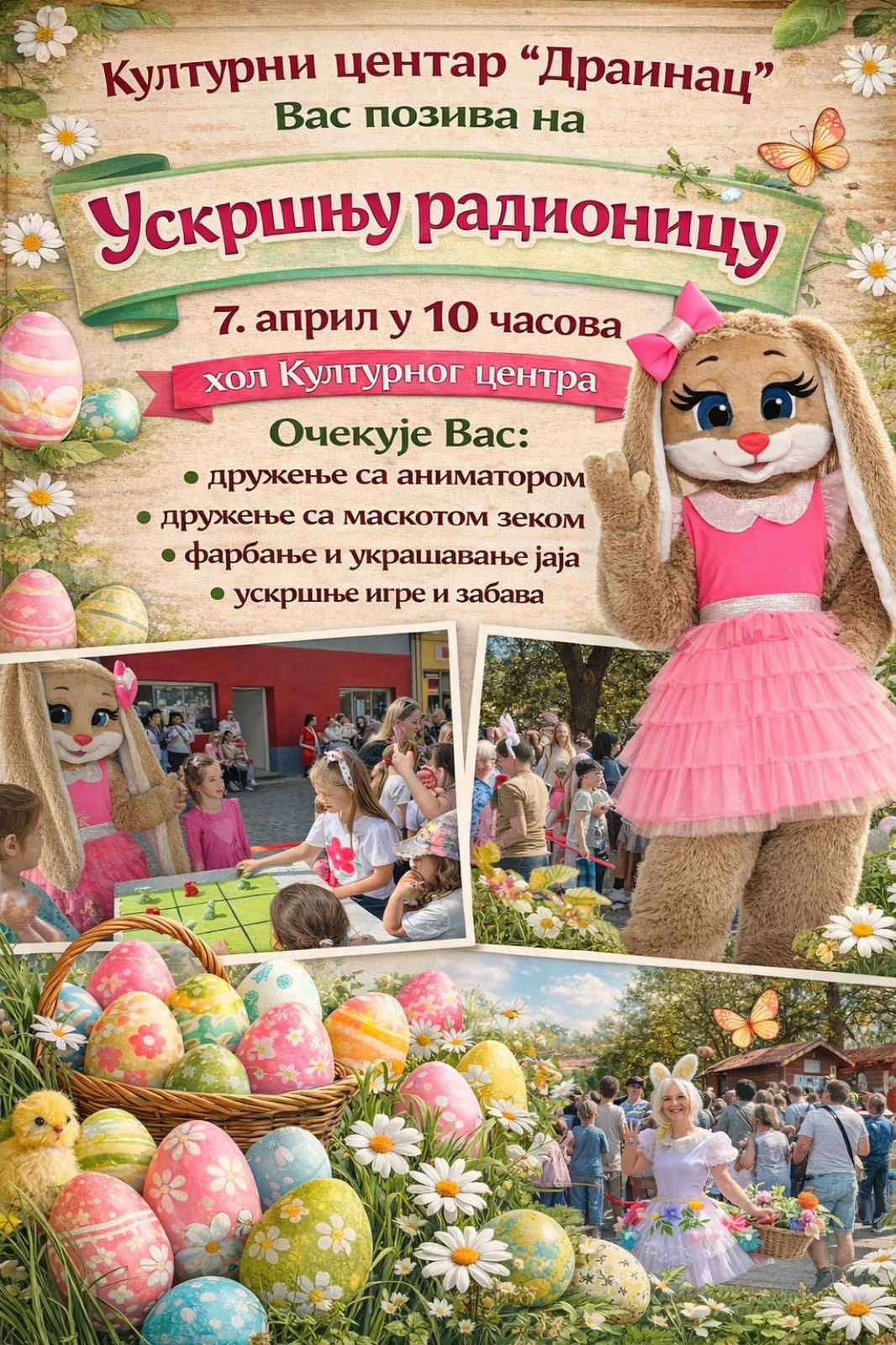 -Za najmlađe smo pripremili bogat i zanimljiv program: druženje sa animatorom, druženje sa maskotom zekom, farbanje i ukrašavanje uskršnjih jaja, kao i uskršnje igre i zabavu. Cilj radionice je da deca kroz igru, druženje i kreativne aktivnosti osete radost Uskrsa i prazničnu atmosferu.