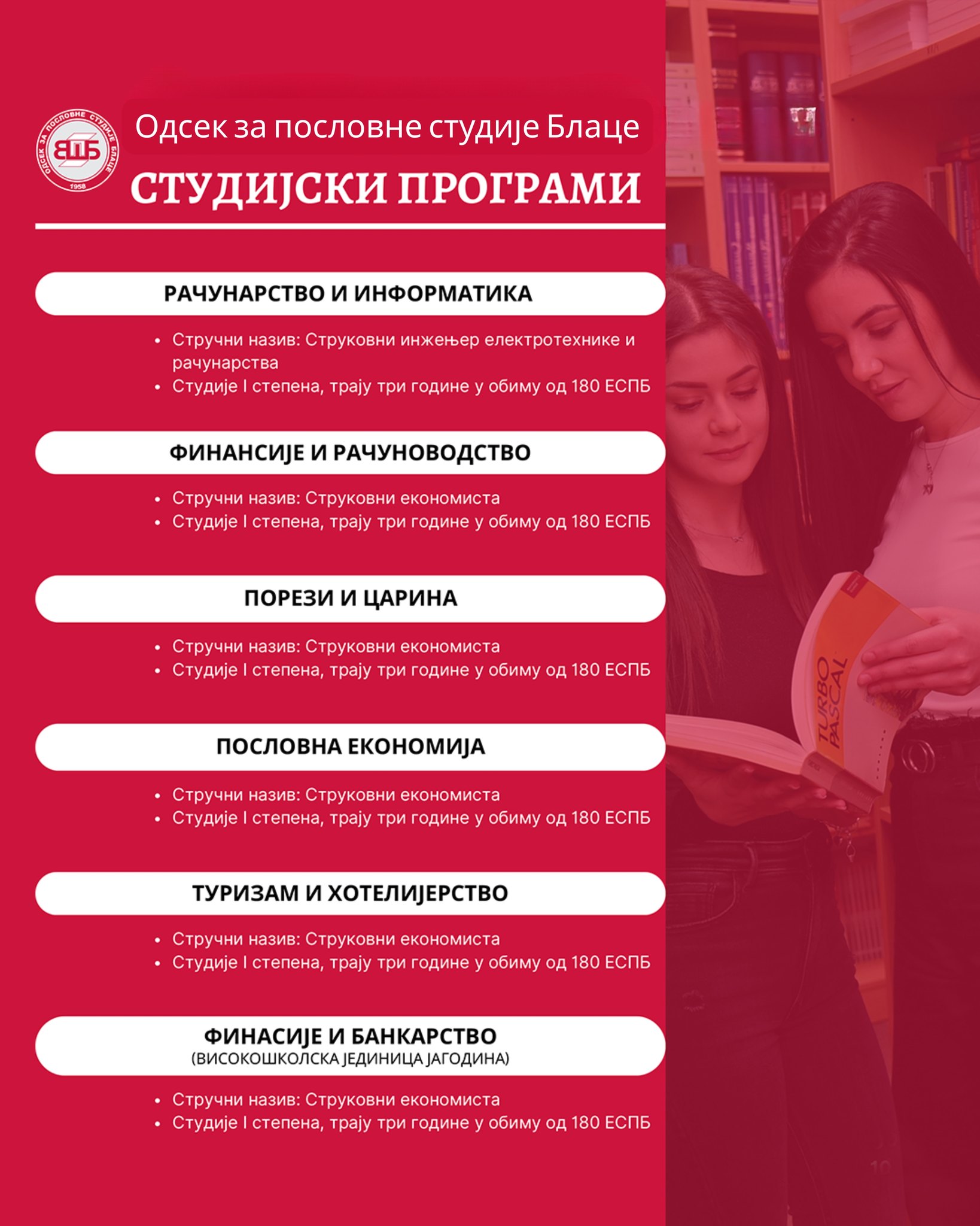 Na Odseku za poslovne studije Blace možeš da biraš između 6 studijskih programa osnovnih strukovnih studija, koji spajaju savremena znanja, praktične veštine i realne potrebe tržišta rada.