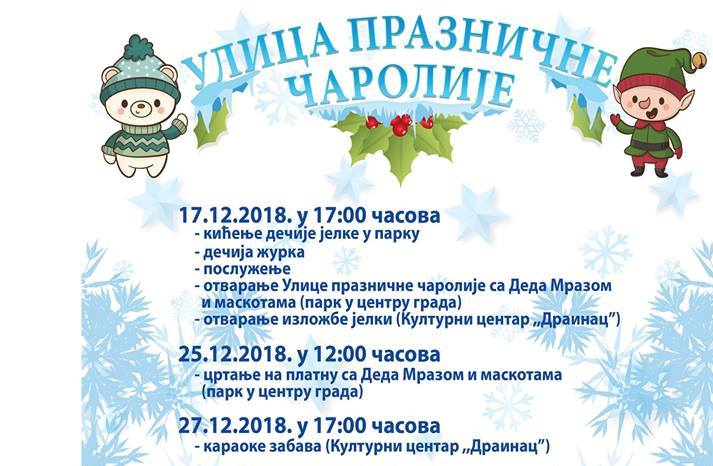 17.decembra od 17 časova : kićenje jelke u parku, dečija žurka, posluženje,otvaranje ulice praznične čarolije sa Deda Mrazom i maskotama( park u centru grada), otvaranje izložbe jelki u Kulturnom centru “ Drainac” u Blacu.