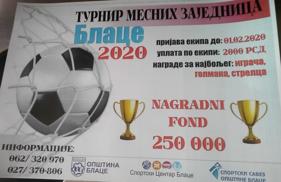 Prijavljivanje ekipa za turnir u malom fudbalu na kojem učestvuju mesne zajednice sa teritorije blačke opštine,traje do subote, 01.februara.