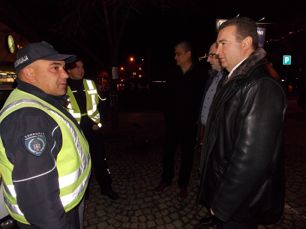 Predsednik Opštine Prokuplje Aleksandar Simonović i predsednik SO Prokuplje Dejan Lazić u novogodišnjoj noći sa dežurnim službama
