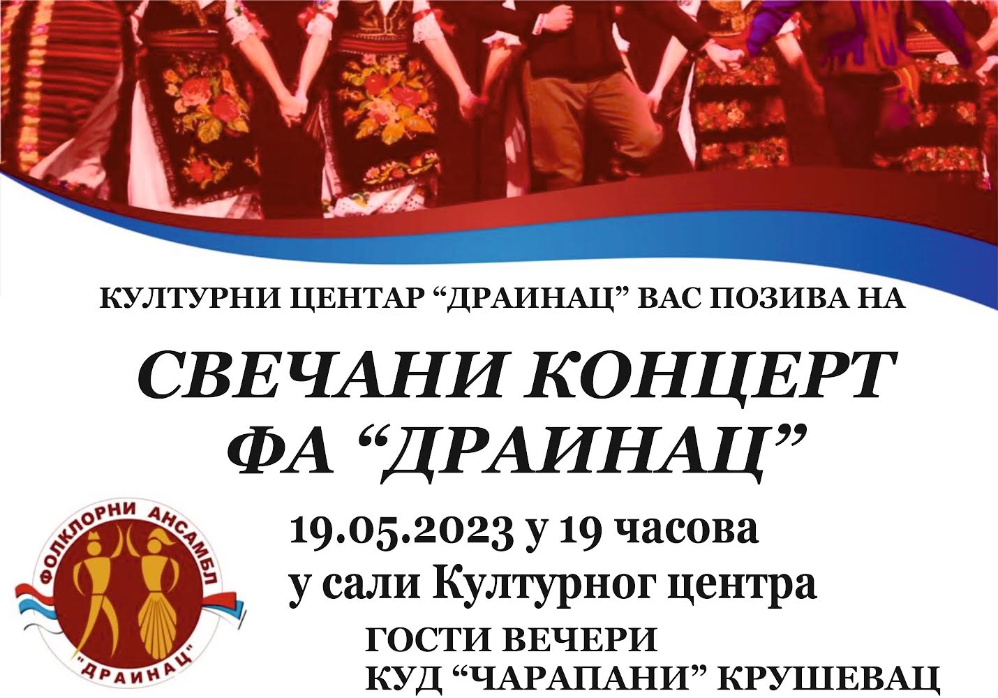 Svečani koncert FA Drainac Blace biće održan u petak, 19.maja u Sali Kulturnog centra Drainac.
