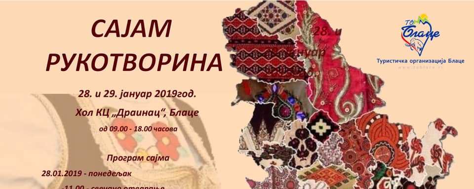 U ponedeljak i utorak, 28. i 29.januara u holu kulturnog centra „ Drainac“ u Blacu biće održan Sajam rukotvorina čiji je organizator Turistička organizacija „ Blace“.
