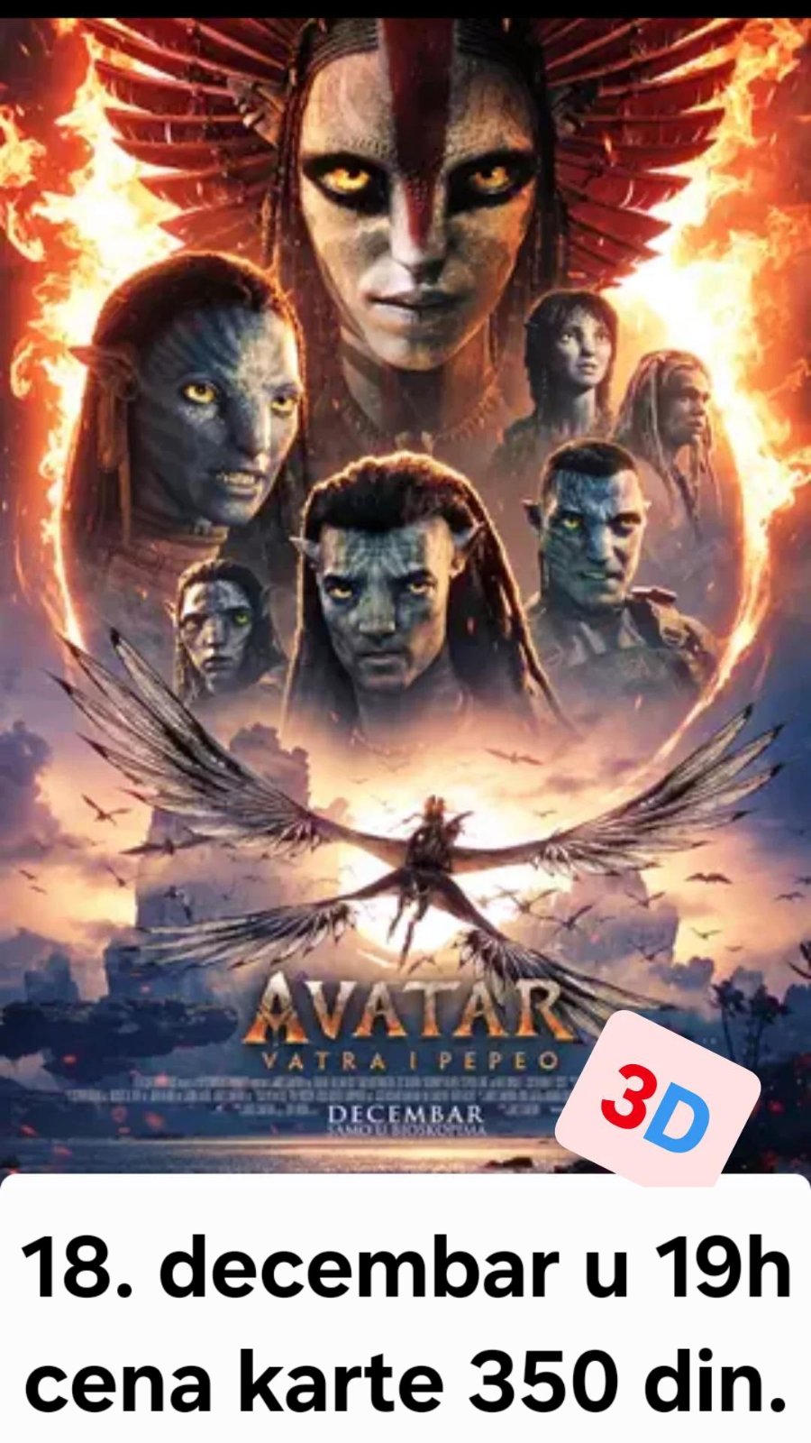 Treći film izuzetno uspešne franšize „Avatar” počinje ekskluzivno da se prikazuje u bioskopima šriom sveta decembra meseca 2025. godine. Džejms Kameron vraća publiku na čuvenu planetu Pandoru gde nas u novoj, impresivnoj avanturi ponovo čekaju marinac Džejk Sali i ratnica Nejtiri. Pored Sema Vortingtona i Zoe Saldana u filmu igraju i Sigorni Viver, Kejt Vinslet i drugi. AVATAR: VATRA I PEPEO sadrži nekoliko sekvenci jakih svetala koje mogu uticati na posetioce koji su skloni fotosenzitivnoj epilepsiji ili drugim osetljivostima na svetlosne stimulanse.