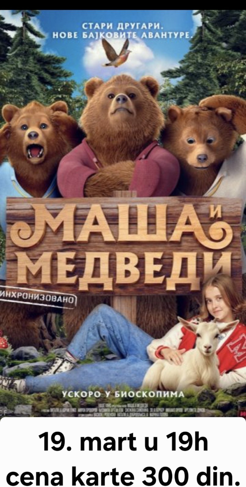 U bioskopu Kulturnog centra Drainac u Blacu film – Maša i Medved. Projekcija 19.marta od 19 časova. Cena karte 300 dinara.
