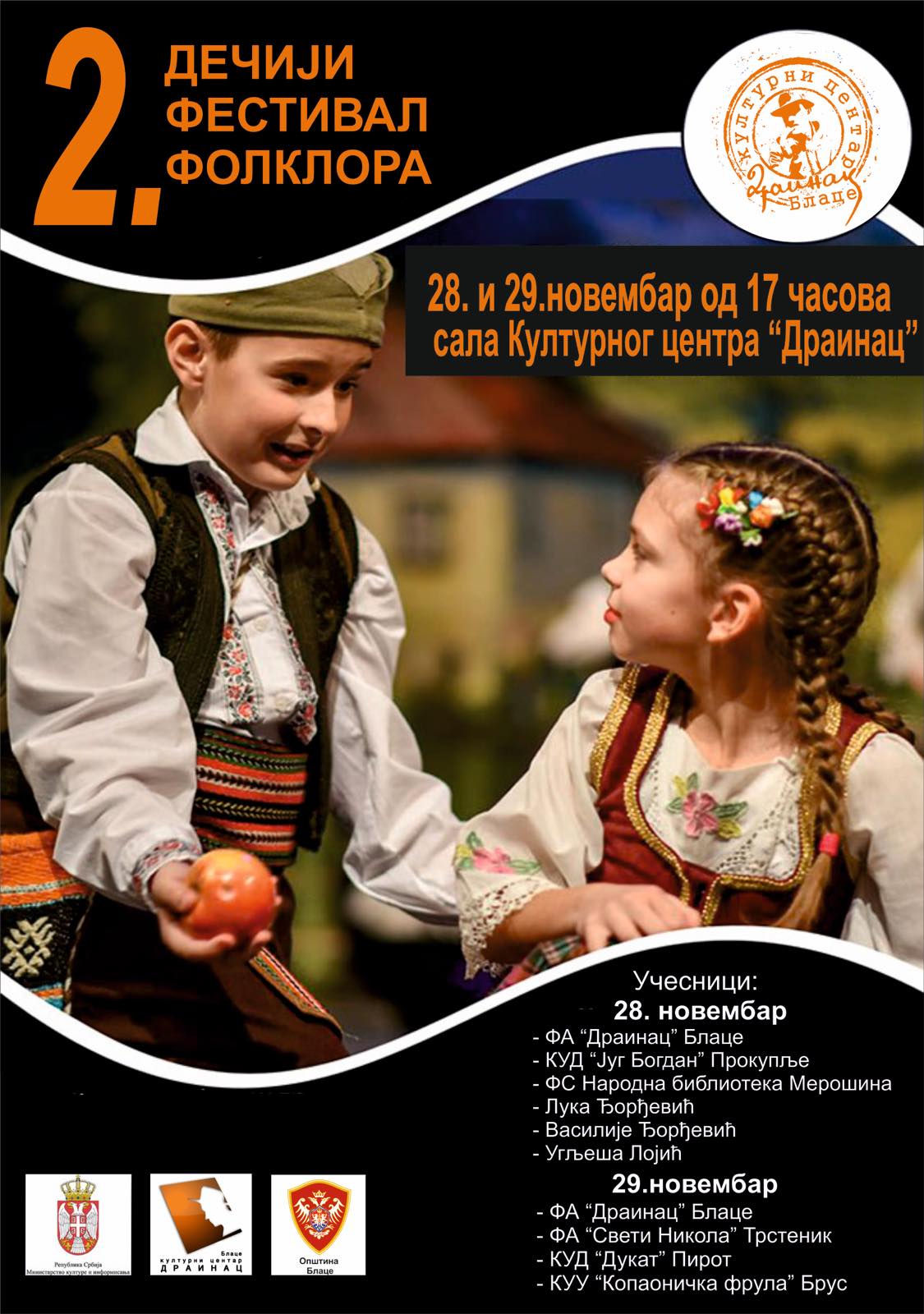 U Kultlurnom centru Drainac u Blacu 28.i 29.novembra 2025.godine od 17 časova biće održan 2. Dečiji festival folklora.